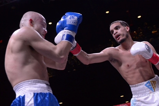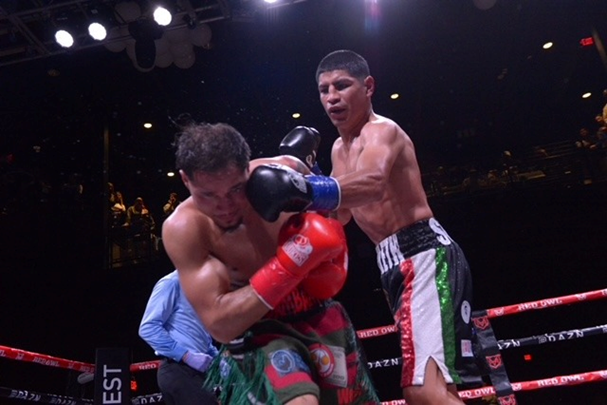 The fourth round lacked aesthetic appeal, but Montoya was the busier fighter, even dislodging Perez’s mouthpiece midway through, prompting referee Harvey Dock to have it replaced. Shortly thereafter, Montoya landed a punishing uppercut to Perez’s body. Sporting a confident smile, Montoya continued to advance, reminiscent of Alexis Arguello’s style, walking his opponent down and landing shots to both the head and body. It became clear that Perez was struggling to find an answer for Montoya’s relentless approach and was visibly uncomfortable as Montoya pressed forward with determination.