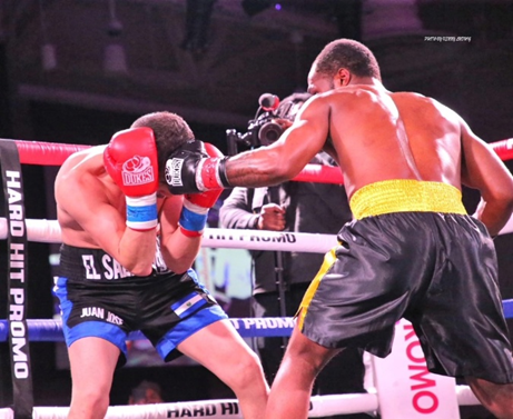 In the co-main event – a scheduled six-round junior-middleweight bout – someone forgot to tell Adonis “The Promise” Wilkins (7 wins – 0 losses – 0 draws – 6 kos) Philadelphia fighting out of Newark, Delaware that there was no “Fight of the Night” trophy for outstanding performance. Wilkins attacked Juan de la Cruz Rodriguez (13 wins – 32 losses – 1 draw – 7 kos) El Salvador fighting out of Front Royal, Virgina, at the opening bell – hell-bent on separating him from his senses going to the head and body – turning his right hook to the ribcage into an uppercut to the head. Rodriguez fought back gallantly but it was evident that Wilkins was on fire burning a path to an early dismissal. His commitment to bombarding his opponent’s body with hooks and uppercut while advancing or sidestepping was extremely effective. He captured the opening round on my scorecard, and I am confident that all three judges agreed.