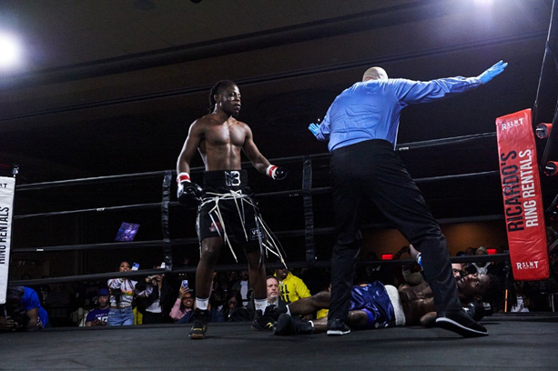 After referee Dali delivered pre-fight instructions, both fighters retreated to their corners, and the match commenced. Haywood approached with high guard, hands positioned just above his ears. His first punch—a left uppercut—countered El-Amin’s jab and landed cleanly on El-Amin’s chin, dropping him to the canvas. El-Amin rose at the count of two, referee Dali dusted his gloves and deemed him fit to continue. Haywood pressed forward relentlessly, determined not to let El-Amin survive the round. He soon caught the retreating El-Amin with a straight right, followed by a powerful left hook that sent El-Amin backward to the canvas, his buttocks striking first, then his back, as if tossed.