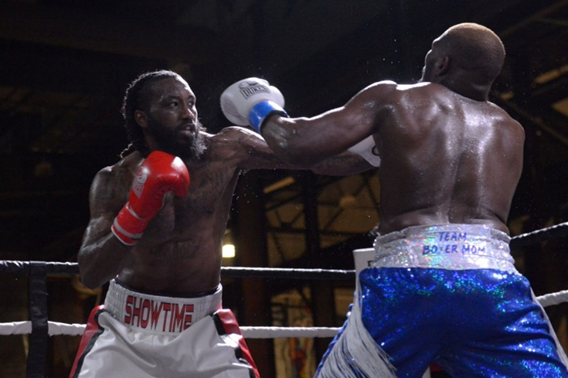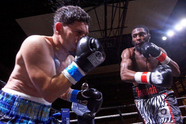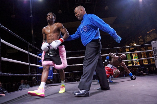 Accompanied by his trainer, Reverend Elvin Thompson, and assistant coach, George Gee, Philadelphia’s James Martin (10 wins – 4 losses – 1 draw – 0 kos) stepped into the ring first for the evening’s second fight—a scheduled six-round super middleweight bout against fellow Philadelphian and cross-town rival, Tariq “Showtime” Green (6 wins – 4 losses – 2 draws – 3 kos). The back of Martin’s robe prominently displayed “Long Live The Bull” in bold letters, a touching tribute to his late father, Jerry “The Bull” Martin of Antigua. Jerry Martin, a three-time light-heavyweight world title challenger, was not only admired in the boxing world but also held a special place in my heart as a fellow West Indian.